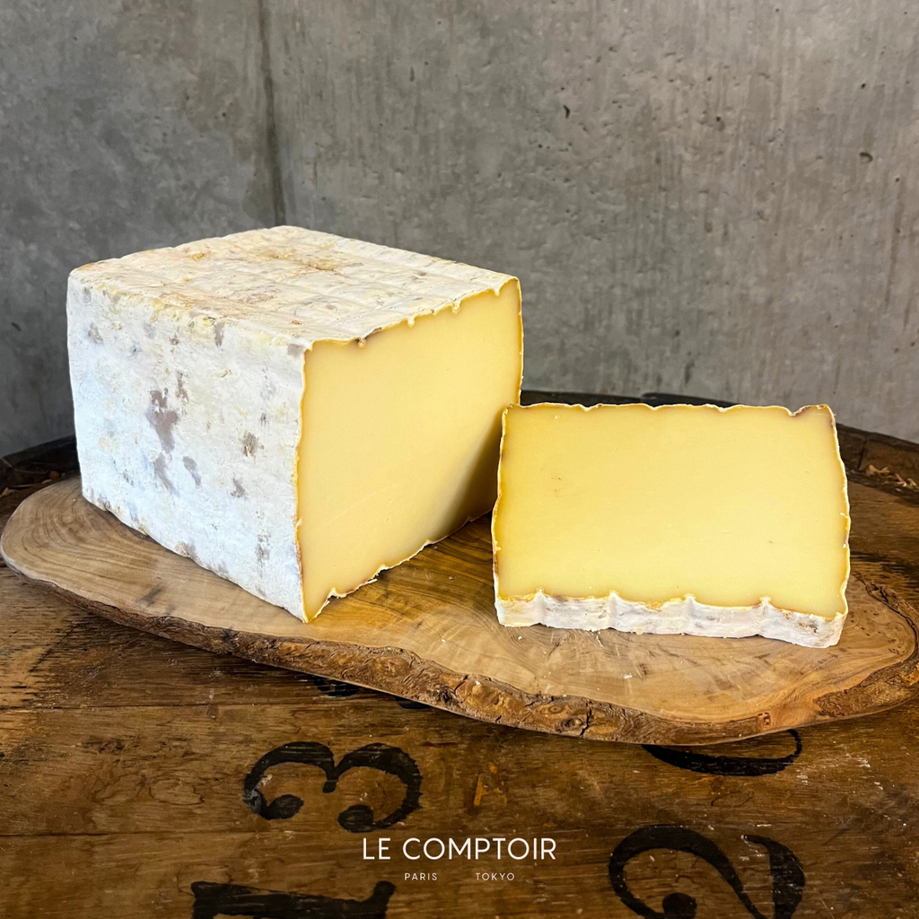 トム・ド・ブルビ・コセナール(Tomme de Brebis Caussenard)はフランス・アヴェロンにて、ブルーの王様と呼ばれるロックフォールと同じラコーヌ種の羊のミルクで作る羊乳チーズのトム。若めの熟成のため、程よい塩気とヘーゼルナッツの繊細な香り、優しくまろやかな羊乳の甘み、しなやかな食感を楽しめる一品。熟成期間が短いものは身が白く柔らかいクリーミーな味わいですが、熟成が進むにつれて美しい象牙色になり、羊乳ならではなのコクと旨味が感じられより豊かな味わいを楽しむことができます。溶かしても美味しく、特徴的な四角い形をそのままスライスしてちょっと贅沢なチーズトーストしたり、この冬最後のラクレットにいつもとちょっと違う羊乳チーズを取り入れていただくのにもぴったり。